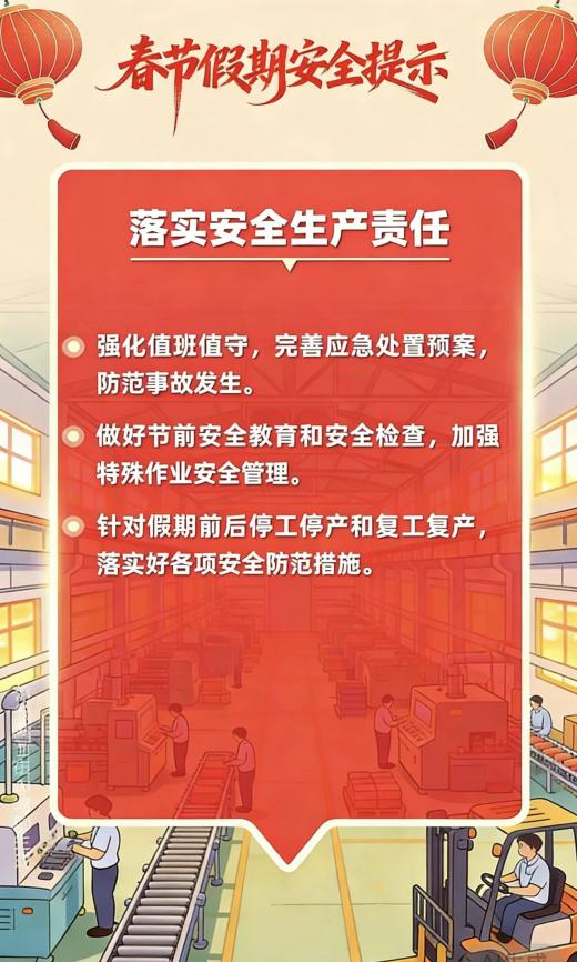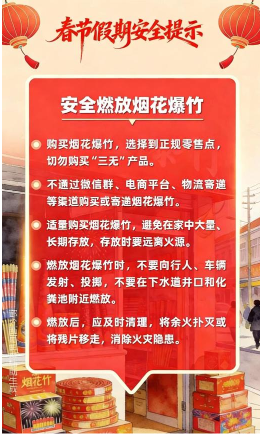新春佳节来到 用火用气用电增加 出游、出行、运输迎来高峰 灯会、庙会、促销等大型活动多 宾馆、饭店、市场、商超等 场所人流密集 烟花爆竹产销燃放正值旺季 低温雨雪冰冻等恶劣天气多发 各类风险隐患交织叠加 安全工作须臾不可放松 这份春节假期安全提示 请查收 防风险、除隐患、遏事故 平安过春节!!!
